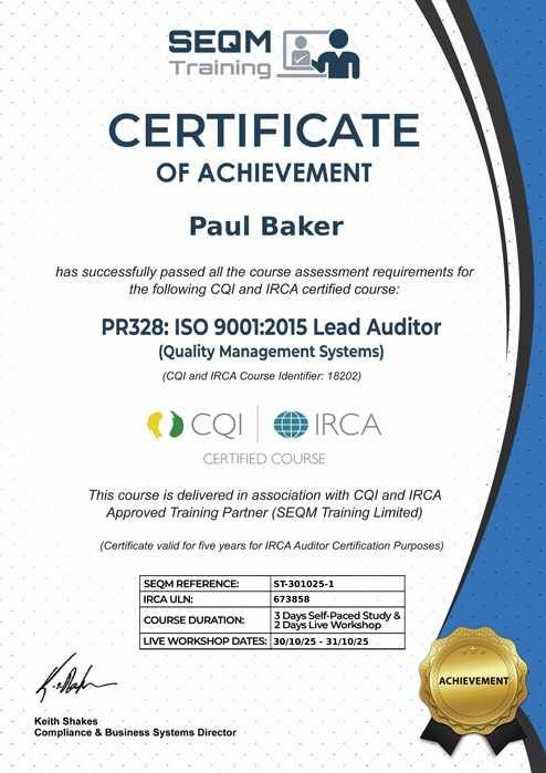 As an ISO 9001 Lead Auditor, I’m trained to assess how well an organisation’s quality management system really works in practice – not just whether the paperwork is in place. Lead Auditor training focuses on planning, conducting and reporting first, second and third-party audits against ISO 9001, including how to evaluate risks, identify non-conformities, test the effectiveness of corrective actions and lead an audit team (DNV, 9001Simplified).